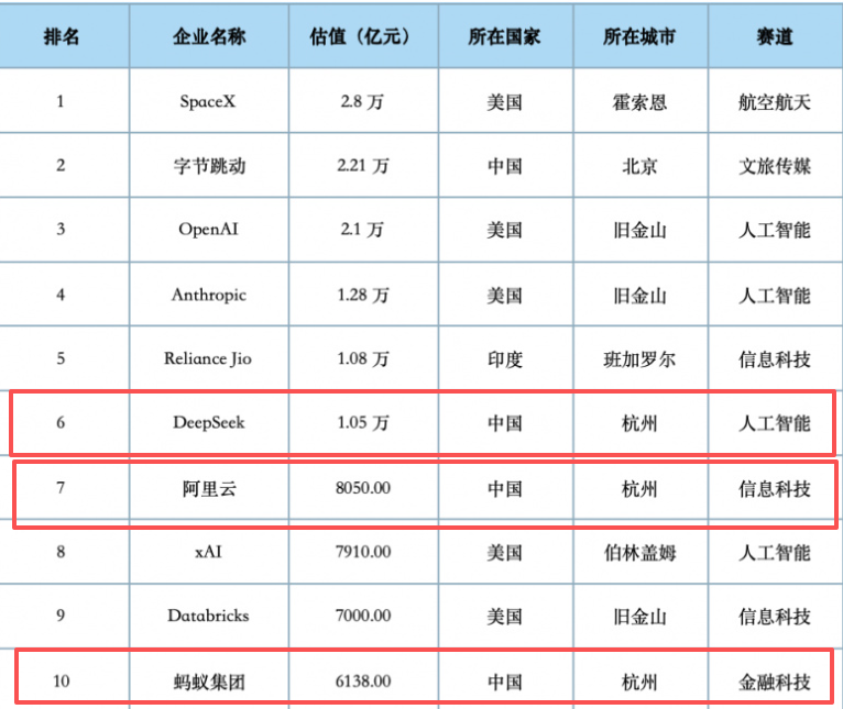 据央视新闻报道,近日,2025全球独角兽企业500强榜单发布,我国共有150家企业上榜,在数量和估值占比上继续保持全球领先。在这份彰显国家创新实力的榜单中,浙江表现尤为亮眼,全球估值前十企业中,中国占4席,浙江独揽3席:DeepSeek、阿里云、蚂蚁集团如三颗新星,刷新“创新浙江”的天际线。