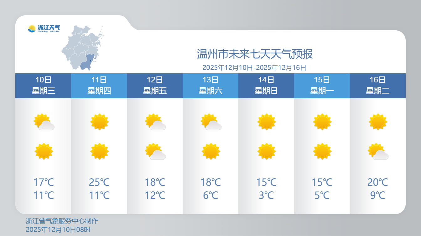 未来一段时间,浙江在晴好天气的“大本营”下,气温持续“上蹿下跳”,大家要关注气温变化,及时调整衣着与作息时间,进入较为温暖的室内环境时不要急于减少衣物,外出时及时增添衣物,并重点注意头颈、腹部和足部的保暖。