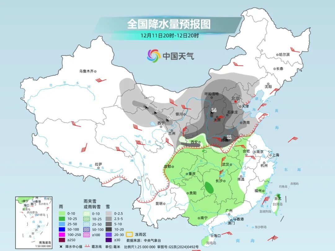 这次寒潮不只是“干冷”,更是“雨雪”+“冻人”的豪华套餐!重点关注今明两天,随着降雪区域进一步扩大,北方地区将迎来今冬第一场大范围降雪。其中,山西中南部、河北中南部、河南中北部、山东中部等地部分地区有大雪,局地暴雪。大城市中,太原、石家庄、济南、郑州、北京、天津等地都可能签收“今冬初雪”大礼包。
