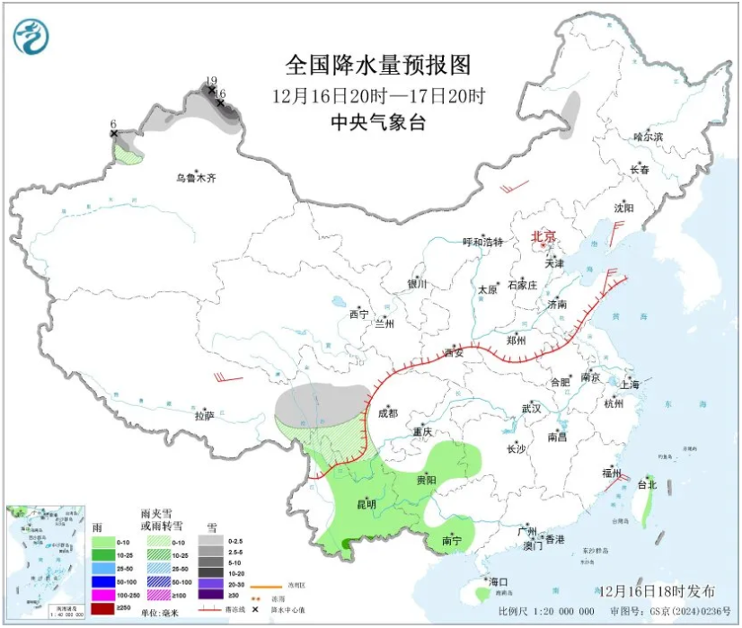 1、16日20时至17日20时,新疆北疆北部、内蒙古东北部、西藏东部、川西高原等地部分地区有小到中雪或雨夹雪,其中,新疆阿勒泰及伊犁河谷有大雪,局地有暴雪。西南地区南部、广西西南部、海南岛、台湾岛等地部分地区有小到中雨。