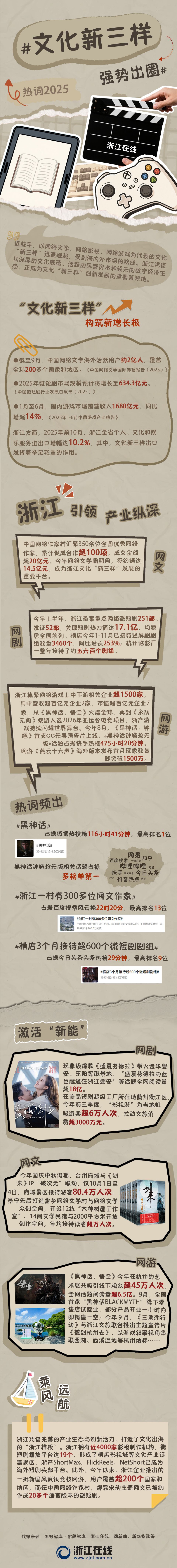 从网剧到网文、网游,浙江以扎实的产业基础与持续的创新投入,推动文化“新三样”走向更高质量的发展和更加广阔的舞台。从杭州的AI漫剧到温州的侨脉传播,从良渚文化IP到武侠游戏席卷欧美,浙江正推动东方故事在全球圈粉。今年11-12月,浙江这片数字经济沃土再掀出海热潮:浙产网文海外活跃用户破2亿,微短剧单剧海外播放量冲10亿,AI赋能让内容出海效率提升3倍。浙江文化“新三样”的故事,不断翻开从本土蓬勃生长迈向全球舞台的崭新篇章。