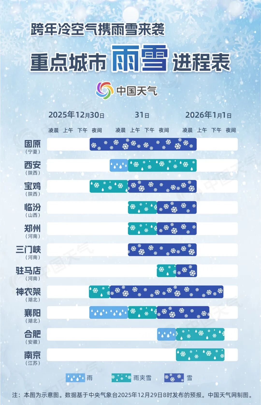 由于冷空气是源源不断到来,全国气温也好似坐上了滑梯,一路下降。中东部多地气温将在2025年12月31日至2026年1月3日降至近期低谷,不少地方甚至将刷新今冬以来新低。其中,2025年12月30日夜间至2026年1月1日早晨,黄河以南将迎来一次大范围雨雪天气过程。