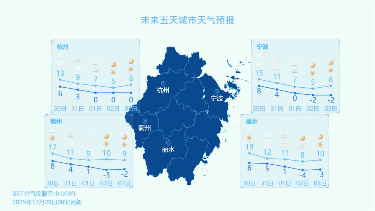 预计元旦假期前两天,杭州的最高气温只有5℃~8℃,妥妥的冰箱冷藏室水平;3日至4日早晨,平原地区最低气温会跌到-3℃~1℃,有薄冰或冰冻,山区-4℃~-7℃,有严重冰冻。