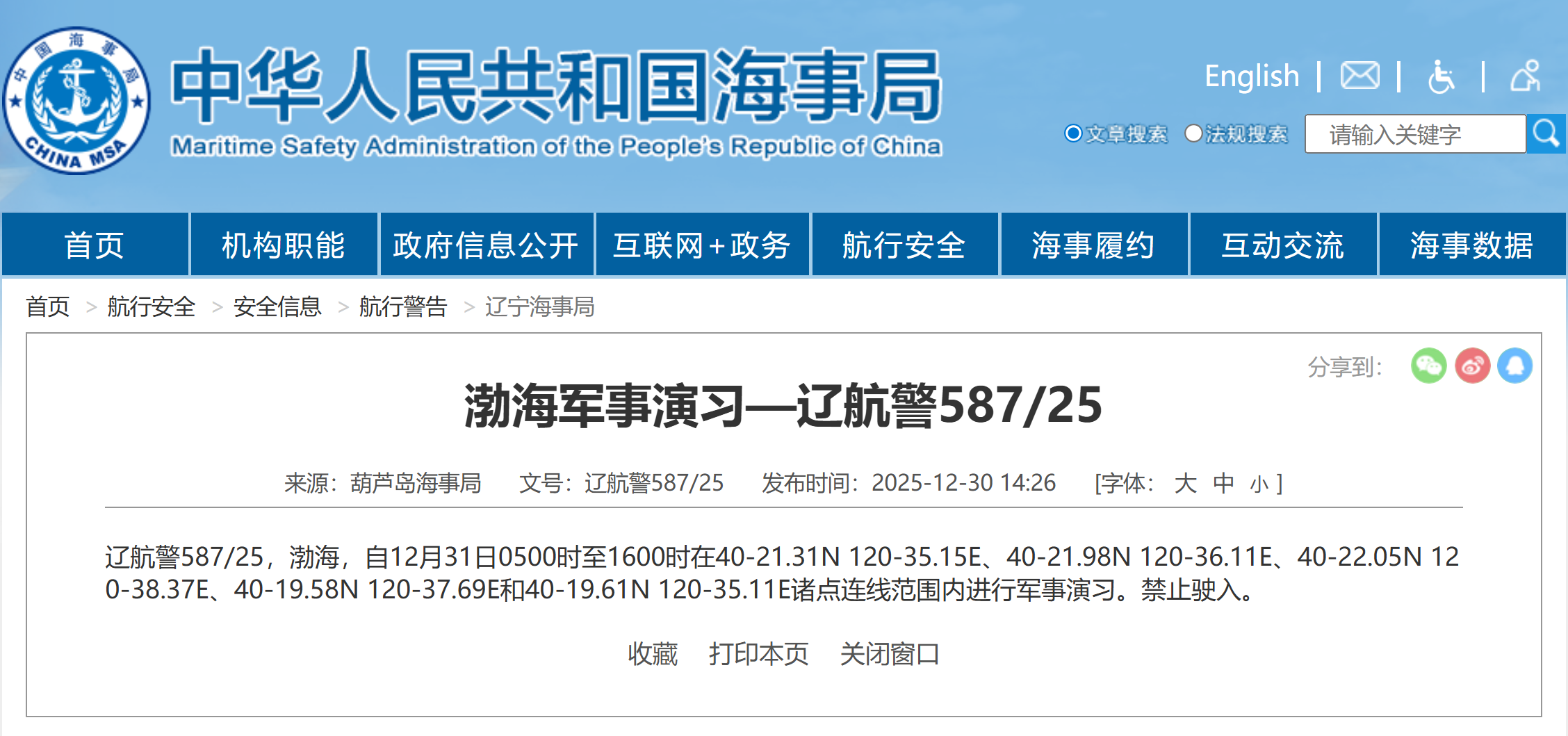 据中国海事局网站消息,葫芦岛海事局发布航行警告,12月31日5时至16时,渤海部分海域进行军事演习,禁止驶入。
