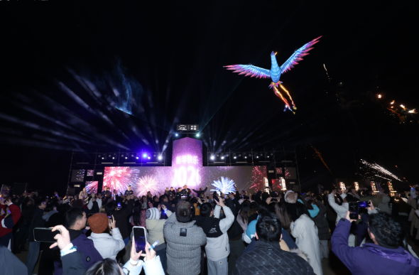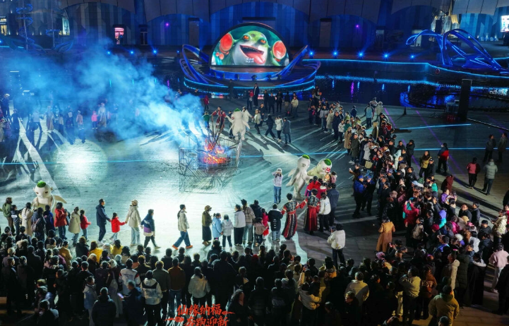 自主研发的大型无人机装置“翼展飞龙”与“火凤凰”在夜空追逐盘旋,将传统寓意与硬核科技完美融合;火箭升空的璀璨光轨、蓝色篝火与造雪机打造的冬日场景,搭配零点烟花秀,形成全方位视听盛宴,同步带动餐饮、露营、文创、住宿等消费场景全面升温,周边酒店与特色民宿全部客满。