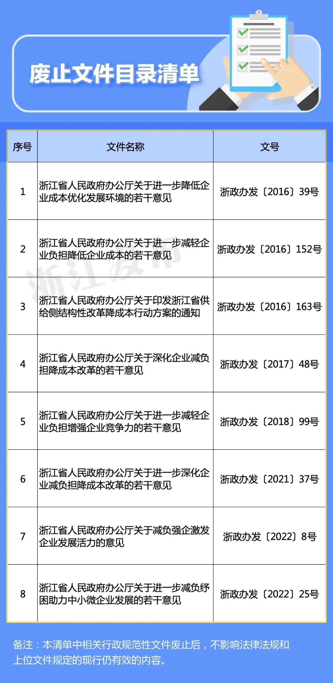 为贯彻落实省委、省政府减负降本工作部署,结合《浙江省行政规范性文件管理办法》(省政府令第372号)等相关要求,浙江对支持企业减负降本方面的8个行政规范性文件进行了清理。近日,省政府办公厅印发《关于进一步支持企业减负降本的通知》,对需保留并延续执行的条款进行了汇总通知。