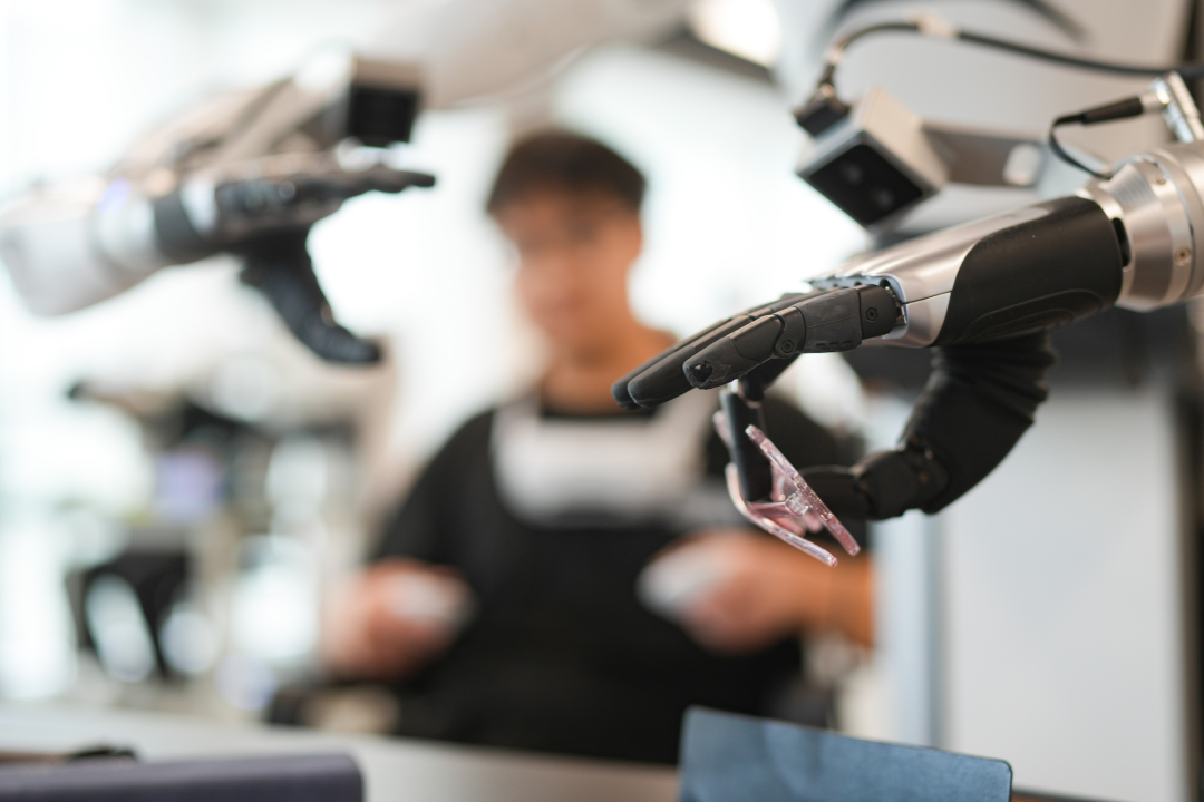2025年9月23日,工作人员在绍兴上虞区的杭州湾具身智能创新中心专用场景采集区操作机器人收放眼镜 图源:新华社