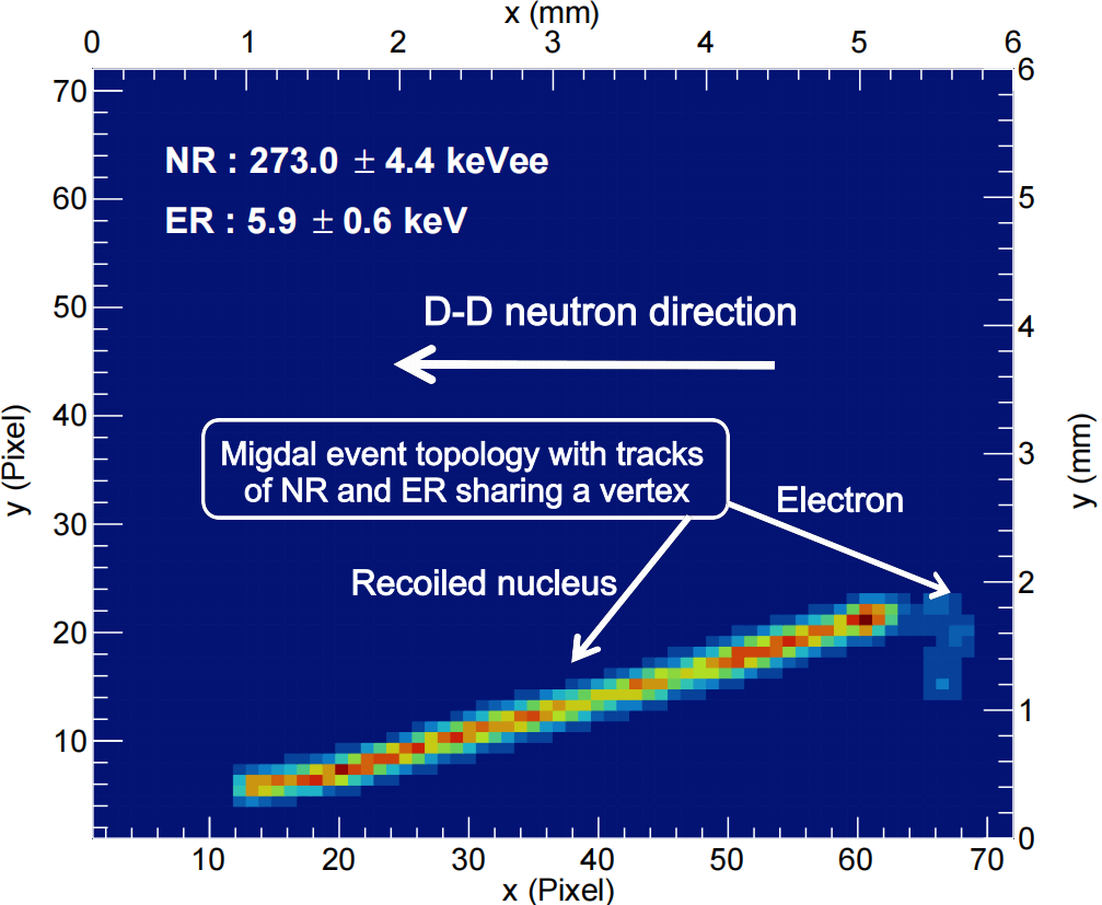 米格达尔(Migdal)效应是1939年苏联科学家Migdal通过量子力学计算,预言当中性粒子与原子核碰撞时,反冲原子核将部分能量传递给核外电子。一个原子的原子核突然获得能量(例如:α衰变,β衰变,中性粒子碰撞)加速运动时,原子核在反冲过程中的内部电场变化将部分能量转移给原子核外电子,使电子有概率获得足够能量脱离原子束缚,形成带共同顶点的两条带电径迹(核反冲径迹和电子径迹)。