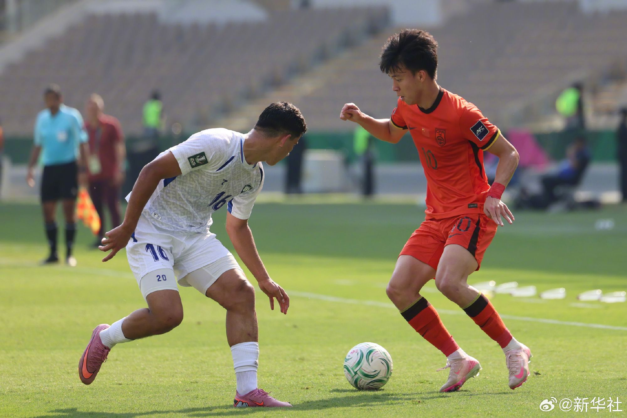 上半场比赛,乌兹别克斯坦队占据明显优势,射门达到11次,其中5次射正。中国队门将李昊贡献多次扑救,力保球门不失。在立足防守的同时,中国队凭借反击与对手周旋,仅有两脚射门,控球率也只有24.6%。