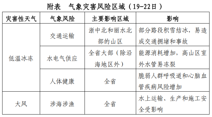 今天,寒潮将自北而南影响我省,日平均气温过程降温幅度可达8~11℃。浙北早晨气温还比较温和,午后则直线下滑,白天最高8~10℃,浙南温暖一点,但夜晚来临,都逃不过降温的命运。风力也在加大,今明内陆地区有5~7级阵风,江河湖面和高山区局部8~9级。22日早晨是气温最低点,大部地区零下1℃到零下4℃,有冰冻,山区零下4℃到零下7℃,有严重冰冻。