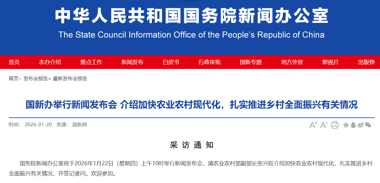 国务院新闻办公室将于2026年1月22日(星期四)上午10时举行新闻发布会,请农业农村部副部长张兴旺介绍加快农业农村现代化,扎实推进乡村全面振兴有关情况,并答记者问。