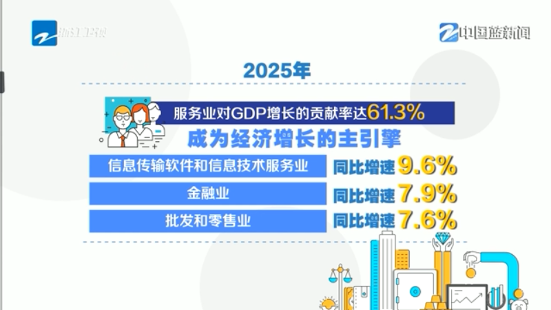 统计数据显示,刚刚过去的2025年,我省一、二、三产增加值同比分别增长3.9%、5.1%和5.8%;其中,服务业对GDP增长的贡献率达到了61.3%,成为经济增长的主引擎,特别是信息传输软件和信息技术服务业、金融业、批发和零售业增加值增长较快,同比增速达9.6%、7.9%和7.6%。