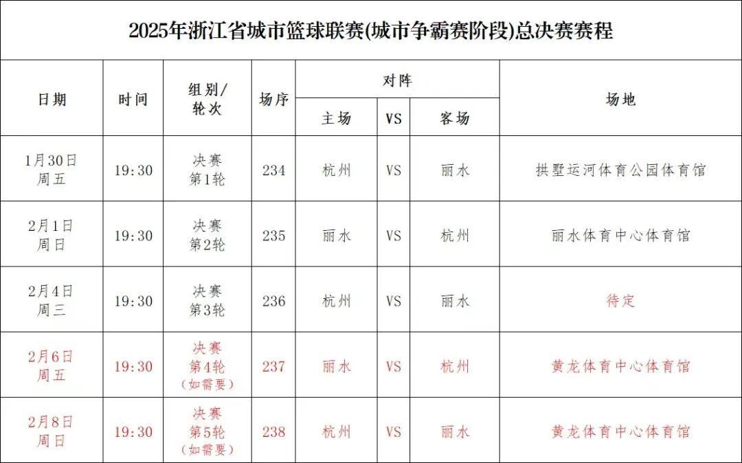 1月24日,浙BA赛事组委会发布了总决赛赛程,总决赛将采取5场3胜制。