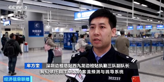 深圳边检总站西九龙边检站执勤三队副队长 牟方奎:我们依托自主研发的客流预测与疏导系统,提前掌握客流情况,动态增设团队快行专道,开通家庭行友好通道,持续提升通关便利化水平。