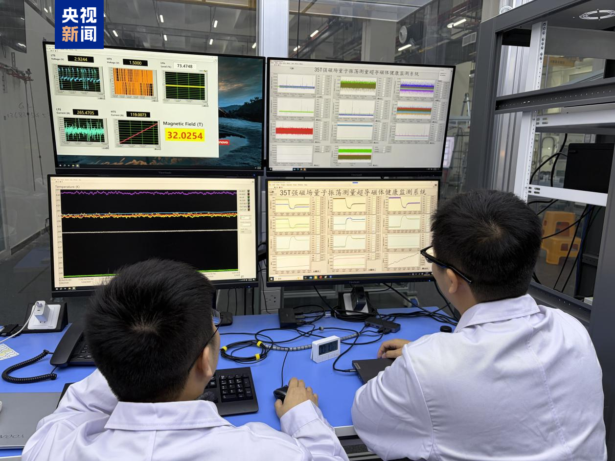 这套以高温超导内插磁体做为核心的全超导用户磁体,口径为35毫米,于2023年实现30特斯拉场强,并向国内外用户开放。经过科研团队对设备材料、结构、工艺的不断升级改造,近日在保持磁体口径35毫米不变的条件下,成功实现35.6特斯拉的最高磁场强度,使该系统成为当前全球物质科学研究领域唯一能提供30特斯拉以上磁场的全超导用户磁体,将有力提升我国在强磁场物质科学研究方面的科研实力。