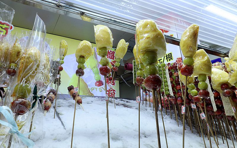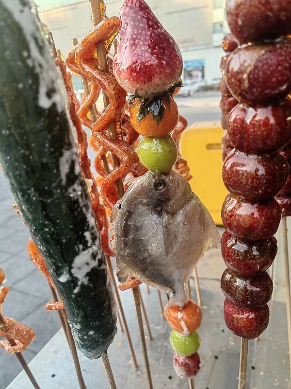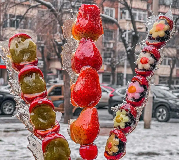 如今,除了常见的山楂果、草莓等原料,冰糖葫芦还卖出新花样。在东北这个“天然大冰箱”,更是“万物皆可冰糖葫芦”。