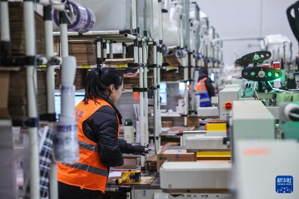 1月30日,义乌综保区跨境电商仓库的工人对完成海关申报的进口商品订单进行打包、张贴快递面单。