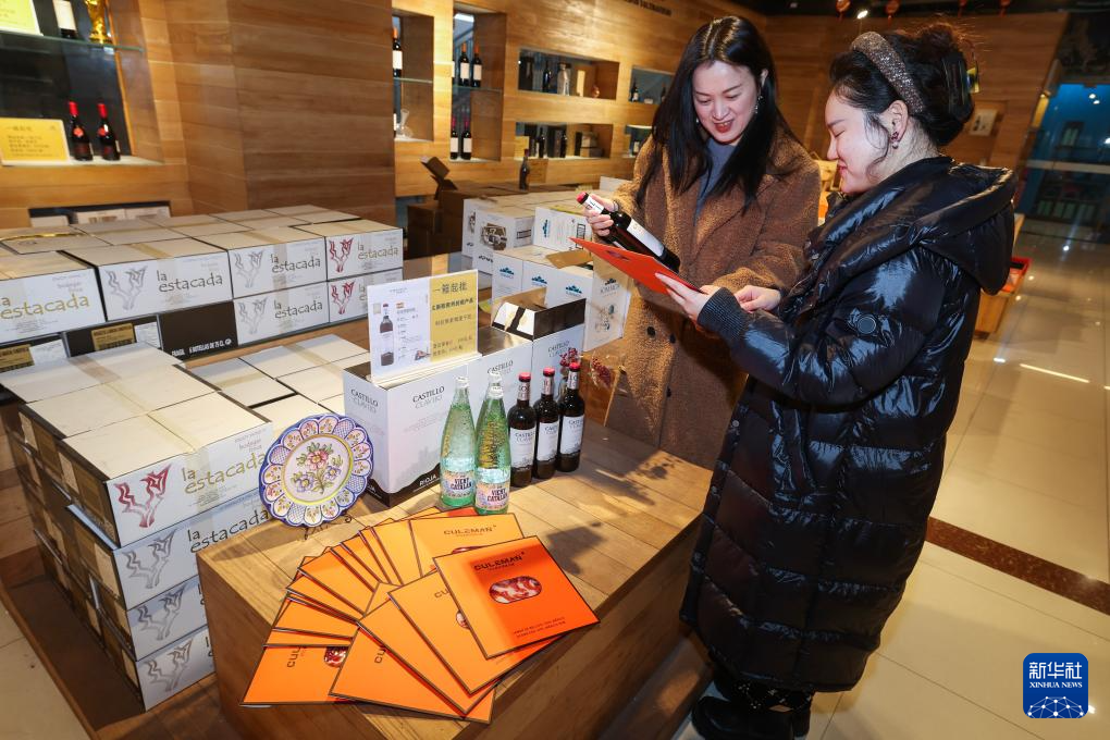 1月30日,在义乌中国进口商品城一家主营西班牙进口商品的店铺内,顾客选购西班牙火腿和红酒。