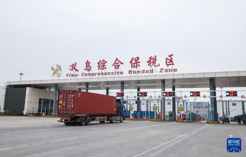 1月30日,一辆满载着进口商品的集装箱卡车进入义乌综合保税区进行保税仓储。