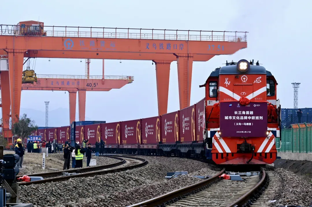2月17日,大年初一,一列满载110个标箱的中欧班列从义乌西站启程,驶往西班牙马德里。这是长三角地区今年开行的首趟中欧班列 图源:新华社