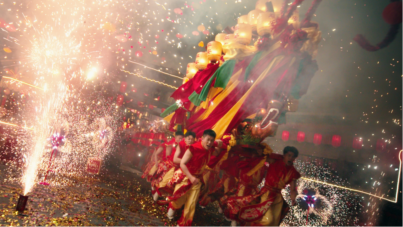 锣鼓齐鸣,烟花璀璨。热气腾腾的呐喊声中,气势磅礴的板凳龙穿过义乌大陈二村,李祖村,分水塘村。火热气氛中,村民们挨个喊出新年愿望——第一声:“都到齐了吗,一个都不少!”第二声:“和和美美,又一年!”第三声:“幸福的味道,非常甜!”