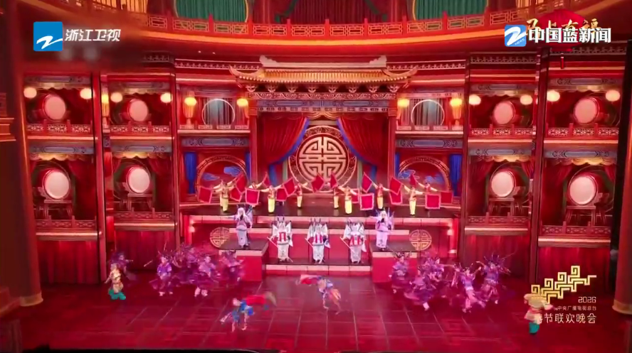 此外,全长9分41秒的戏曲节目《春晖满梨园》,汇集婺剧、越剧等多个浙江剧种的名家新秀。其中,来自浙江婺剧艺术研究院的24名演员,出场时长达2分22秒,创下该院参演春晚时长之最。