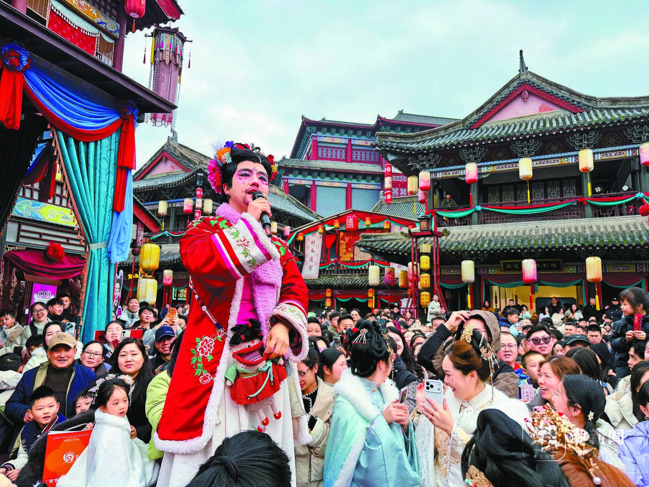 2月18日,东阳横店影视城,游戏角色扮演者与游客鲜活互动。记者 张敏娴 摄
