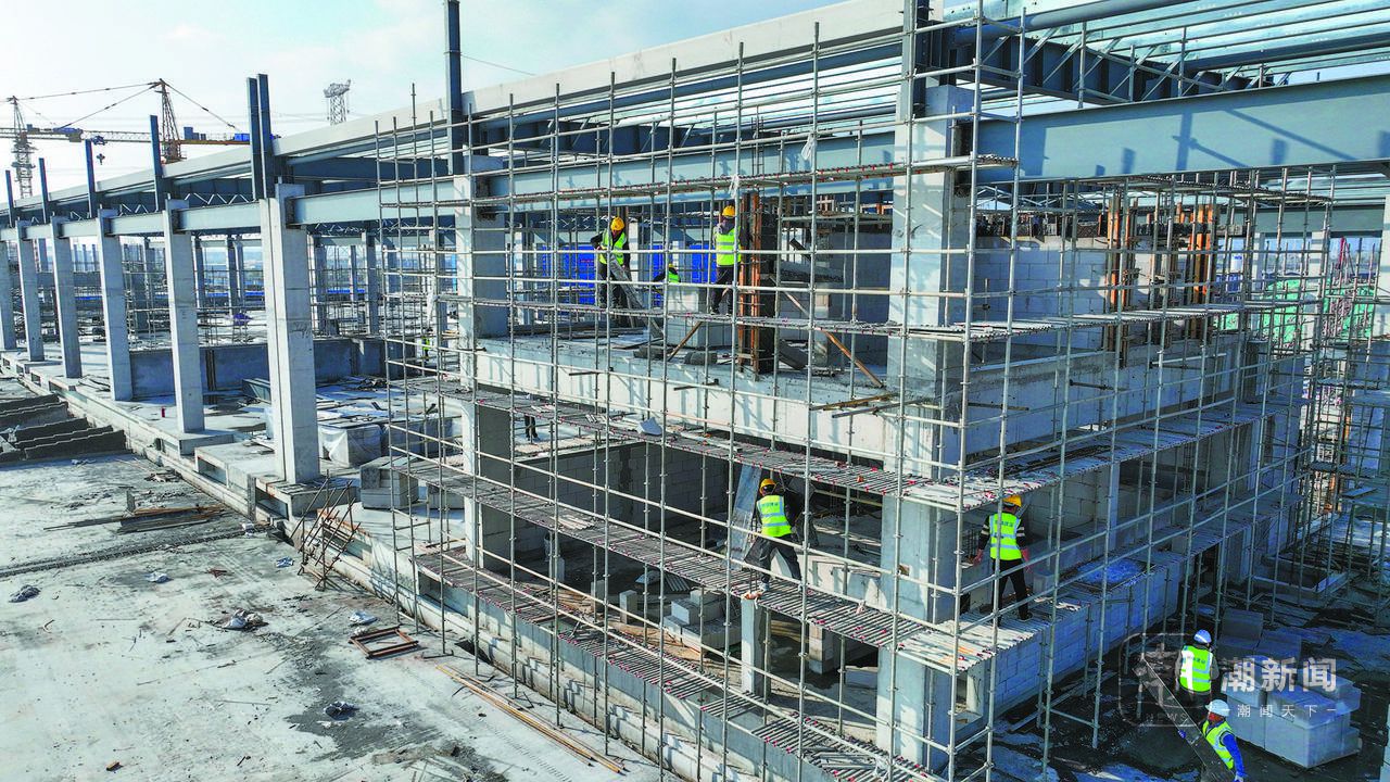 2月18日,金华华东国际联运港中欧班列集结中心施工现场,建筑工人奋力推进项目建设。记者 徐文迪 金思成 拍友 陈业 摄