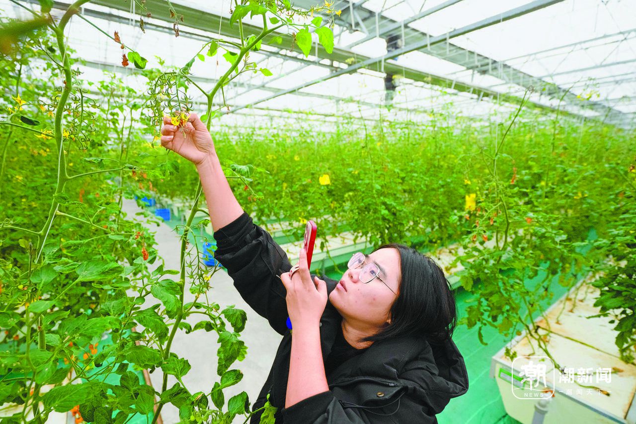 2月19日,杭州临平未来农场雾耕大棚里,值班技术员在观察番茄授粉情况。春节假期,雾耕大棚可以向长三角餐桌提供10吨小番茄。 记者 徐彦 共享联盟·临平 周洌虔 摄