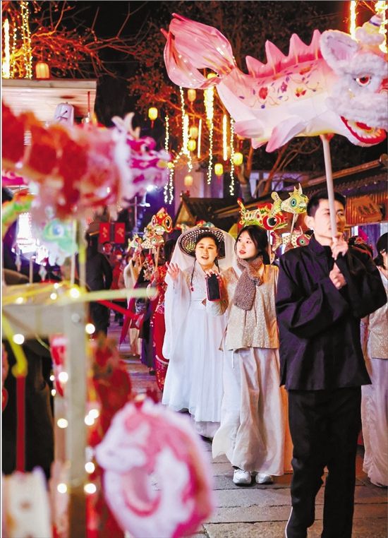 京杭大运河畔的千年古镇新市,春节期间围绕“宋韵”主题推出“新市大吉”新春主题系列活动,以新春灯会、非遗市集、主题演绎三大板块为脉络,重现宋韵年味的生活图景。