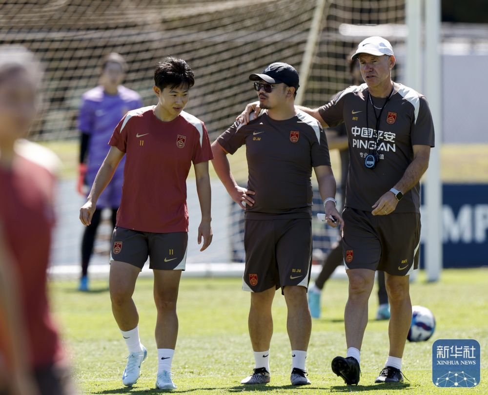 ↑ 中国女足主教练安特·米利西奇(右一)与队员吴澄舒(右三)在训练间隙交流。 新华社发(王霜摄)