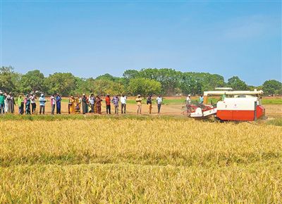 在冈比亚中河区,中国援冈比亚农业技术合作项目组面向当地农户开展水稻联合收割机技术示范教学活动。中国援冈比亚农业技术合作项目组供图