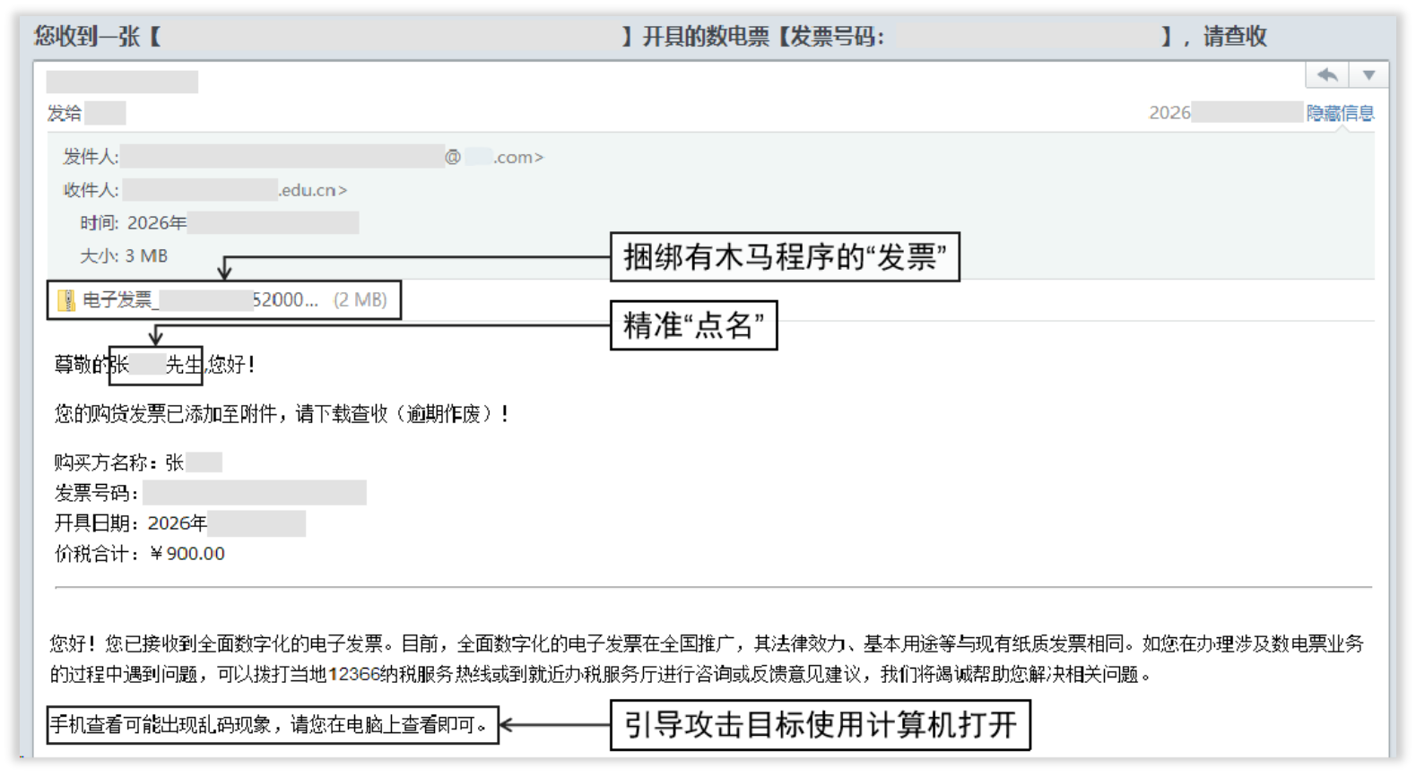 “【电子发票】张某某先生,您的发票已开好,请点击下载”——当收件箱弹出这类带着你真实姓名的电子邮件,你是否会下意识点击?注意!这可能是境外间谍情报机关实施的精准网络攻击。一旦点击邮件中的附件或者链接,设备将瞬间沦为间谍窃密的“突破口”,安全风险随之而来。