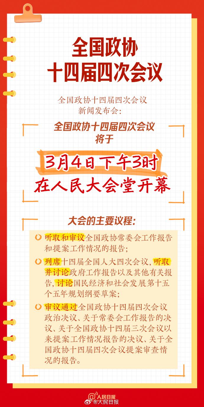 全国政协十四届四次会议将于3月4日下午3时在人民大会堂开幕。关于政协你了解多少?政协的主要职能有哪些?政协委员如何产生?一组两会学习笔记↓↓收藏,学习,共同期待!