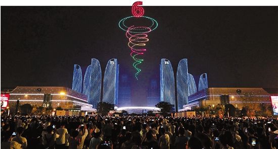 图为全球数贸中心高空的无人机灯光秀(资料照片)。 记者 倪雁强 周旭辉 通讯员 时补法 摄