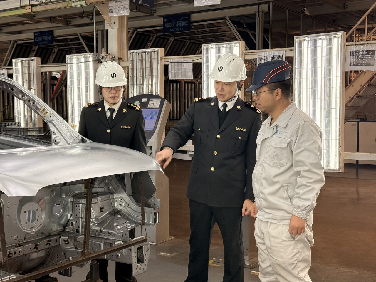1月12日,浙江零跑汽车有限公司金华一厂总装车间内,金华海关关员正在对企业新能源汽车材料以及车载零部件进行监管。范梦娜 摄