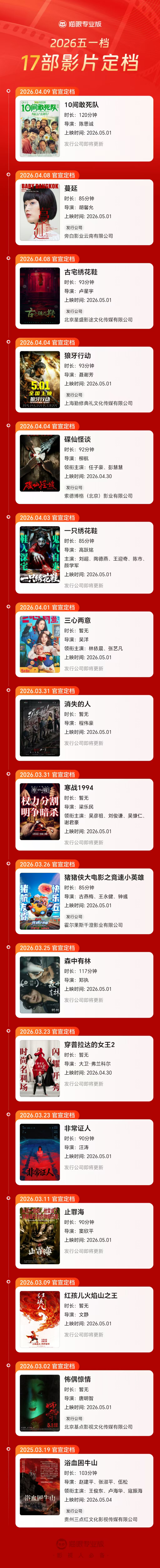 如火如荼的清明档告一段落,档期长尾效应延续,为即将到来的五一档积蓄动能。截至目前,已有17部影片锁定五一档。类型多元,题材丰富,覆盖了喜剧、犯罪、悬疑、动画、惊悚等多种类型。