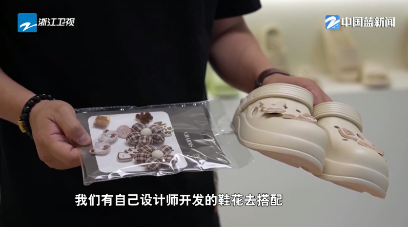 义乌特娜鞋业有限公司董事长刘波告诉记者,他们有自己设计师开发的鞋花去搭配,客户可以根据自己每天的心情去搭配鞋花,一季度做了接近10万双,这双鞋今年的目标是100万双。