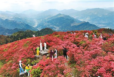 贵州省黔东南苗族侗族自治州丹寨县龙泉山,上万亩杜鹃花竞相绽放,吸引不少游客前来赏花。杨武魁摄(人民图片)