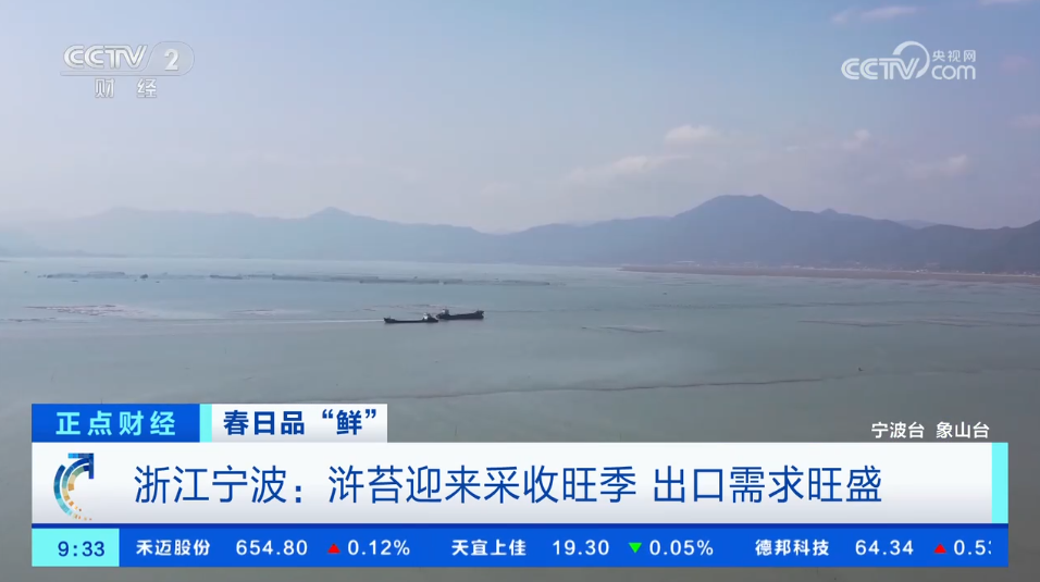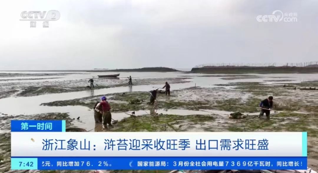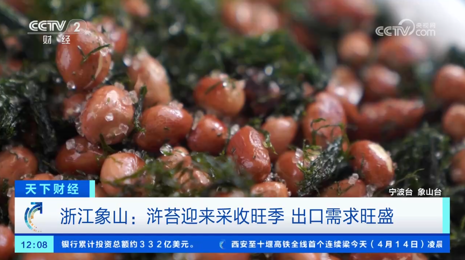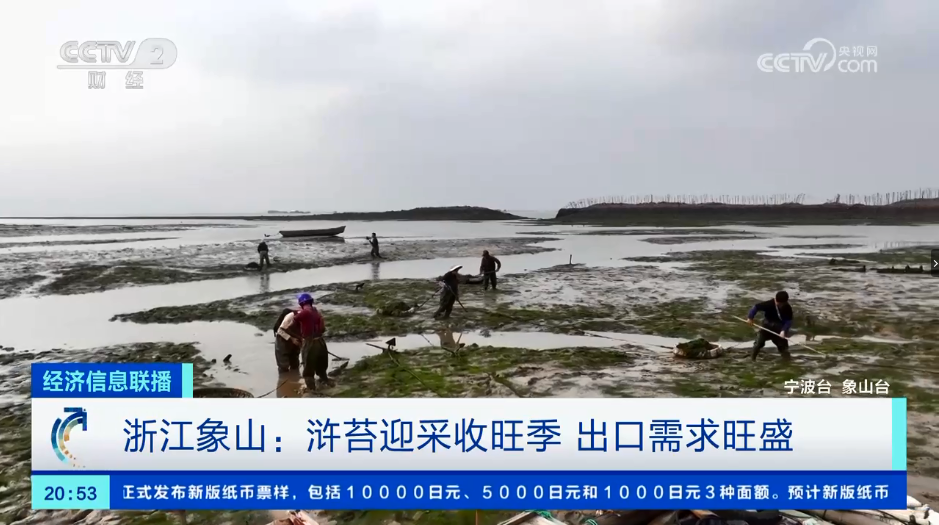 4月14日、15日,央视《正点财经》《天下财经》《经济信息联播》《第一时间》栏目先后播出报道《春日品“鲜” 浙江宁波:浒苔迎来采收旺季 出口需求旺盛》,关注在宁波象山,最近一段时间正是浒苔采收的旺季,村民采收的浒苔基本不愁卖,制成品还被销往日本、韩国等国家。
