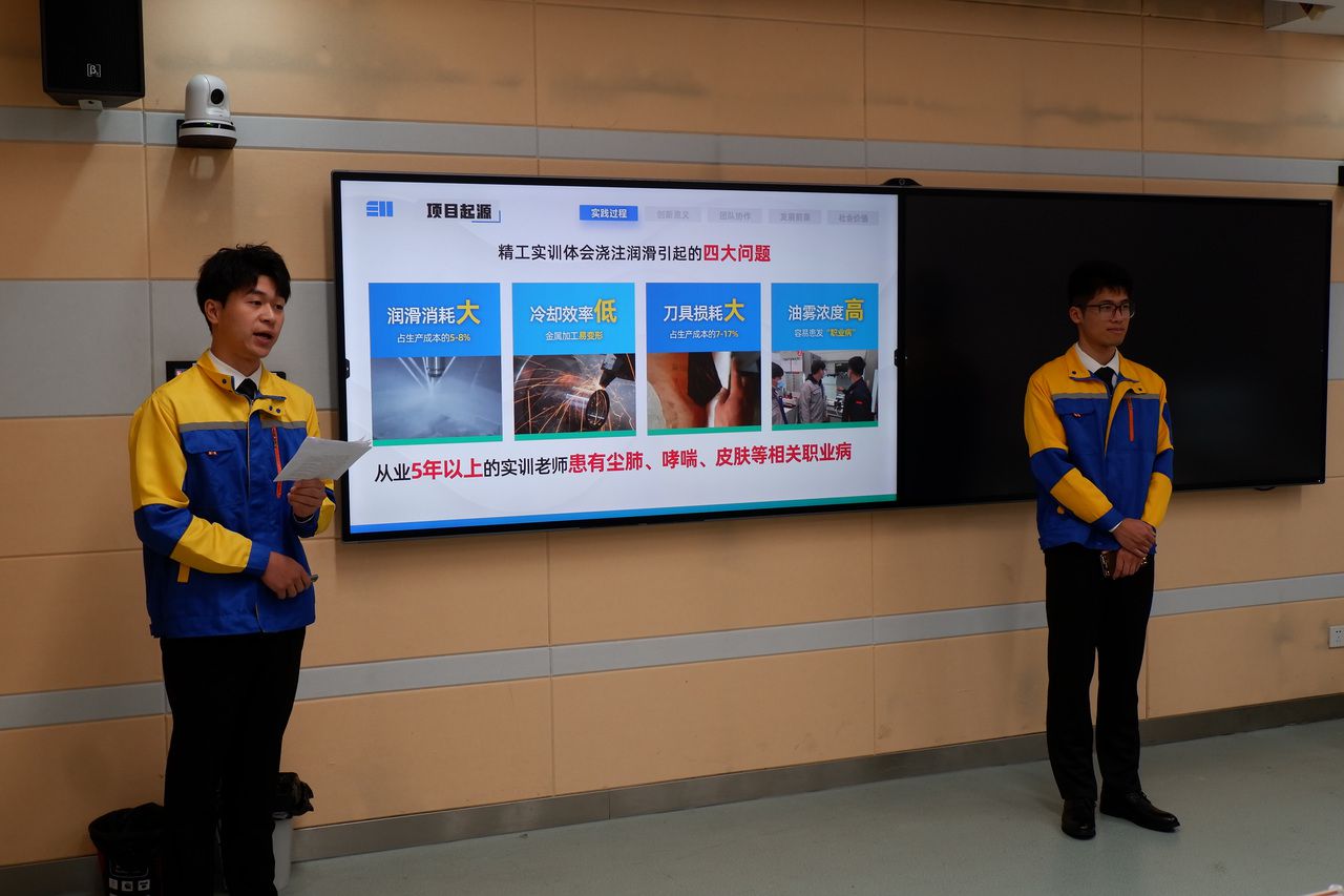 2023-2024年度中国大学生自强之星、机电工程学院学生白荣快自大一入学便跟随指导教师吕涛深入一线参加金属加工实训,过程中,他发现常年身处高油雾的工作环境,实训工人会咳嗽不断,甚至患上了尘肺、哮喘等职业病。于是,他带领团队研发出磁流体气雾润滑技术并于今年3月成立公司,研发产品革新了传统金属切削润滑方式,助力企业降本增效,同时降低从业人员患尘肺、哮喘等职业病的风险。