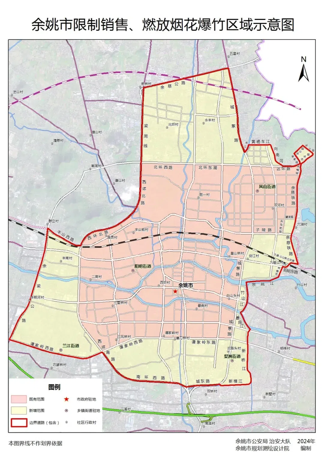 城区南环西路—西环南路—谭家岭西路—余梁公路—丰山西路—西环北路—梁周线—余慈公路—城东路—东江—黄杨车江—向南河—达环路—学前路—环山路—达环路—月梅路—余慈铁路—九垒山公铁立交路—阳明东路—向南河—余姚江—竹山江—最良江—新桥江—新横江—城东路—南环西路由道路、河流、铁路形成的封闭区域。其他地区不列入限制销售、燃放烟花爆竹区域。