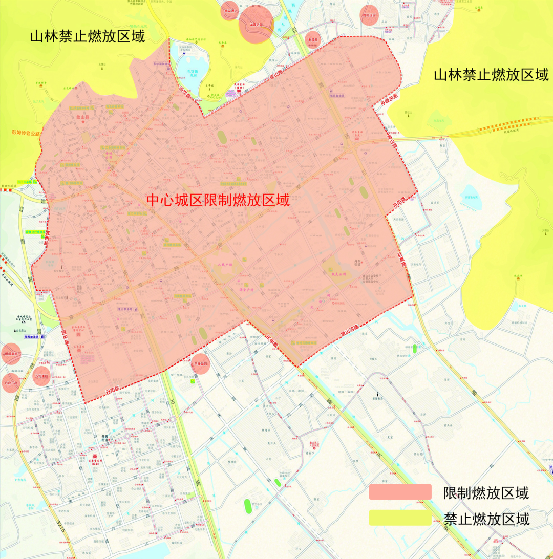 1、彭姆岭老公路―城西路―丹峰西路―园中路―丹阳路―天安路―象山河路―巨鹰路―丹阳路―海山路―丹峰东路―塔山路―东谷湖路以西至彭姆岭老公路封闭圈。