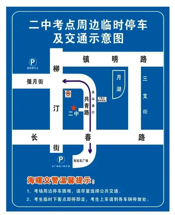 考试期间南大路(天童南路口至顺明路口)货车禁行,所有车辆禁止鸣笛。
