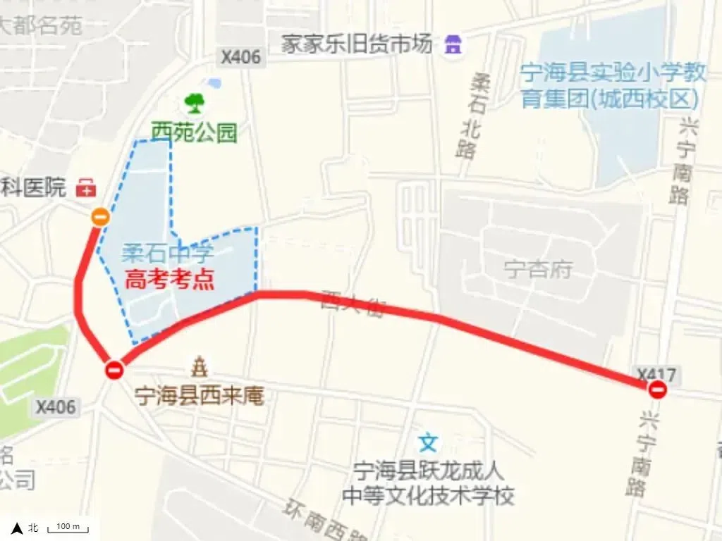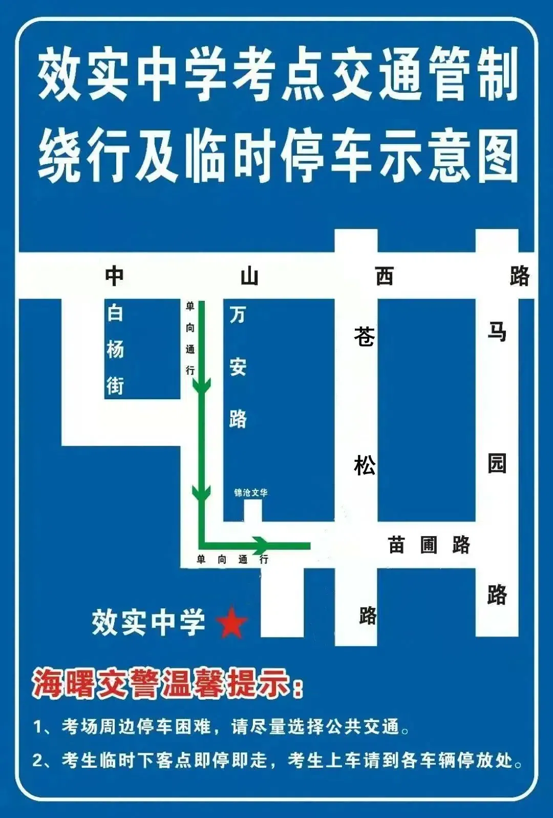 ▶白杨街交通管制:考试开始前1小时和考试结束后半小时内,白杨街(苍松路口-万安路口)、苍松路、苗圃路进行交通管制。白杨街(苍松路口-万安路口)实行由西向东单向通行: