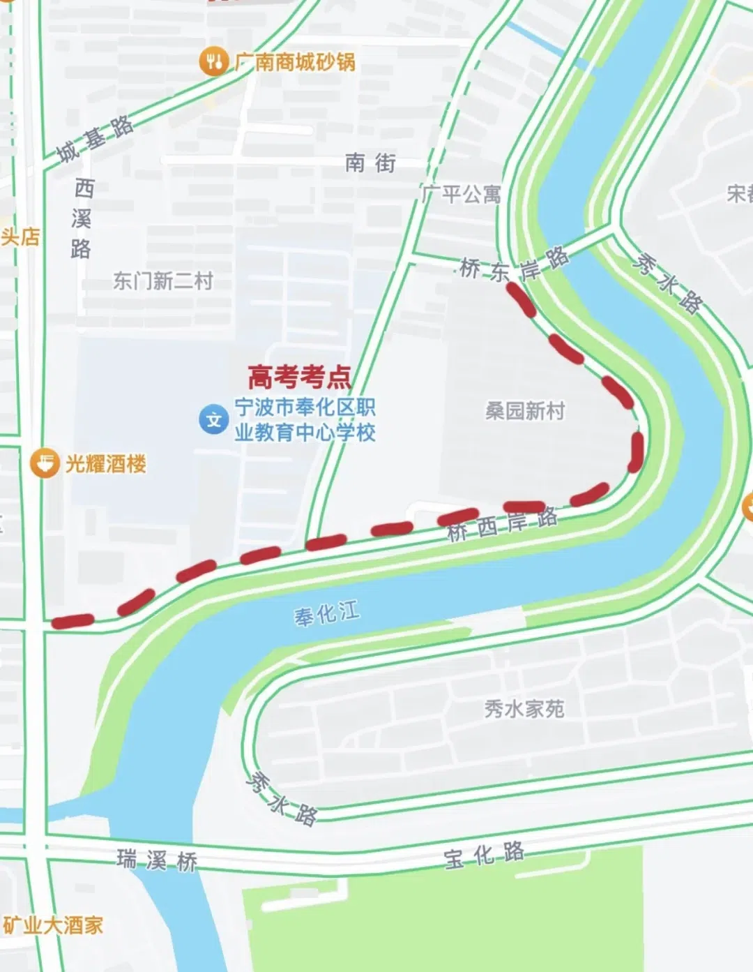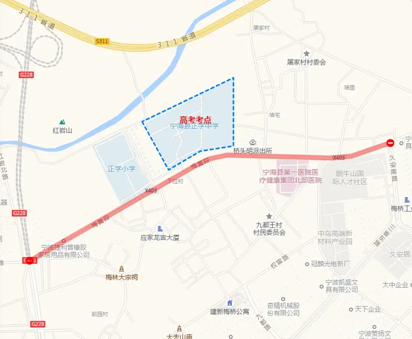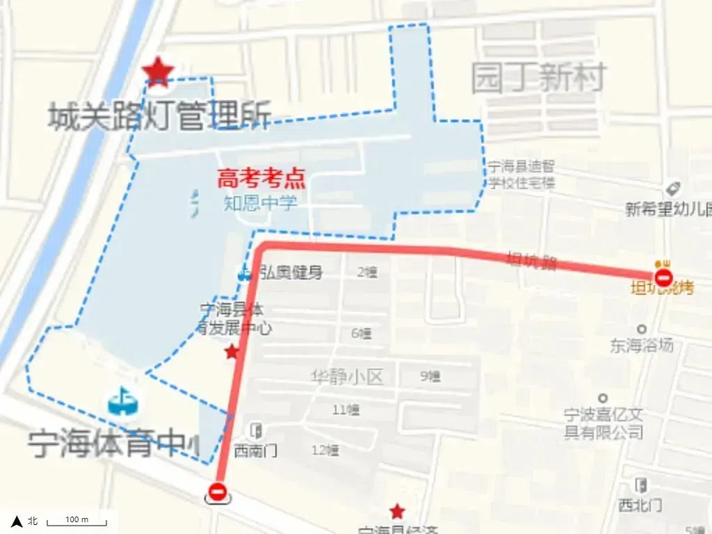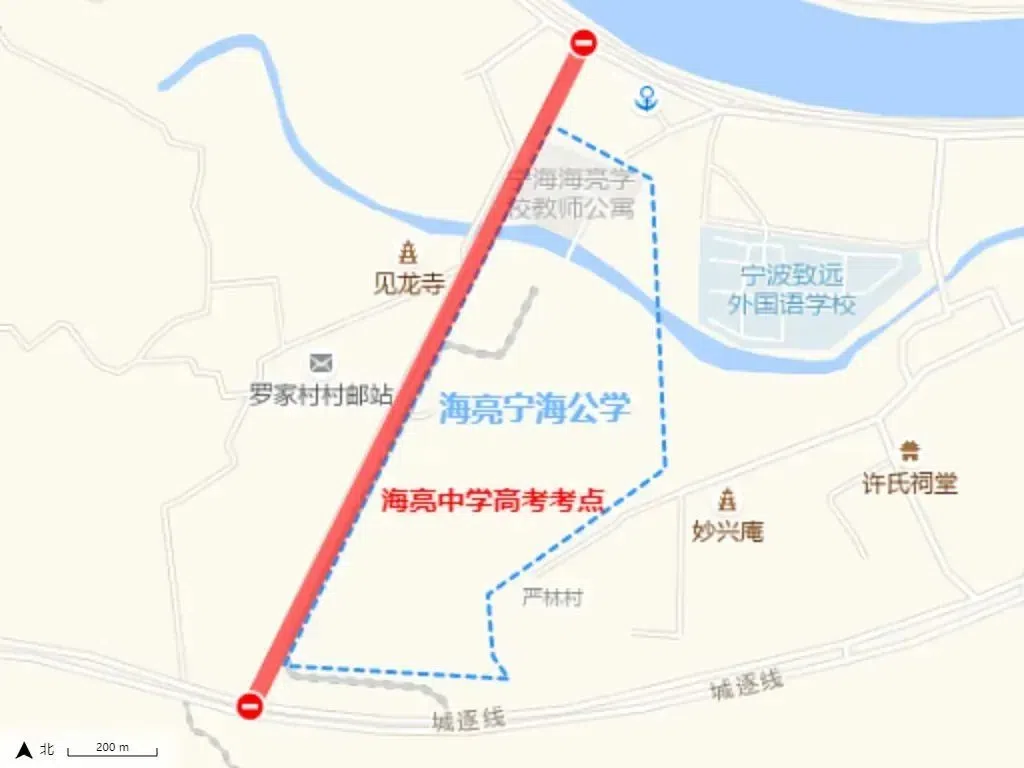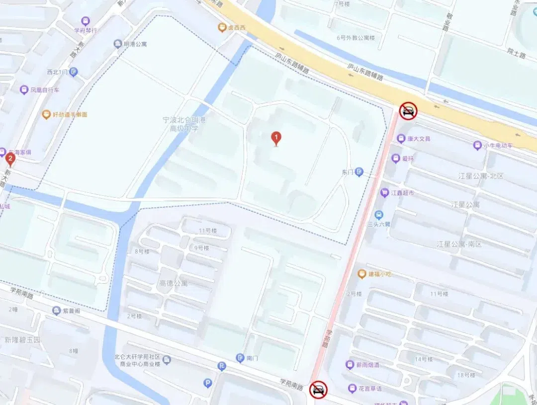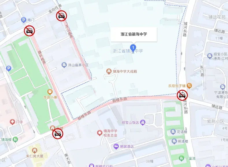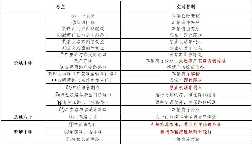 芦江路北仑中学路口,禁止除送考车辆外其他车辆进入北仑中学。学校周边禁止机动车鸣笛,接送车辆请按规定有序停放。