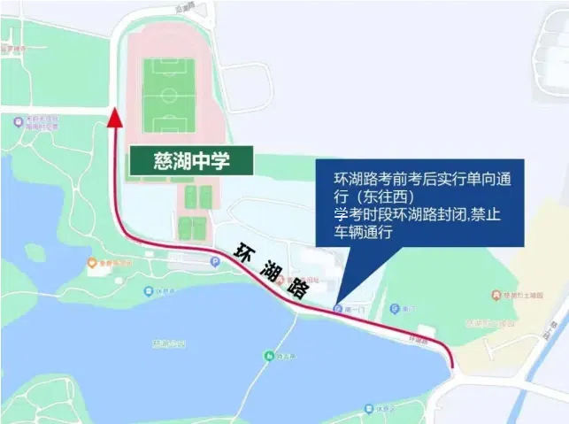环湖路考前考后实行单向通行(东往西),学考时段环湖路封闭,所有车辆禁止通行,学考区域禁止鸣笛。