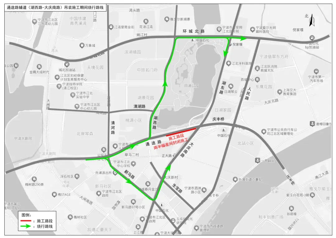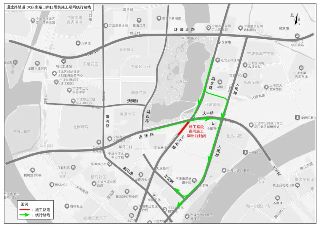 因庆丰桥人非系统改造工程施工需要,根据《中华人民共和国道路交通安全法》第三十九条的有关规定,决定对通途路地面道路(湖西路-大庆南路)、通途路与大庆南路交叉口交通组织进行调整,具体如下: