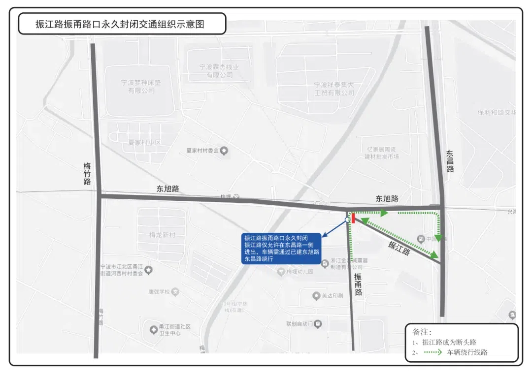 另因区域路网调整,决定自2025年1月5日起,禁止一切行人、车辆在振江路振甬路西口通行,受限行人、车辆可通过东旭路、东昌路等道路绕行。