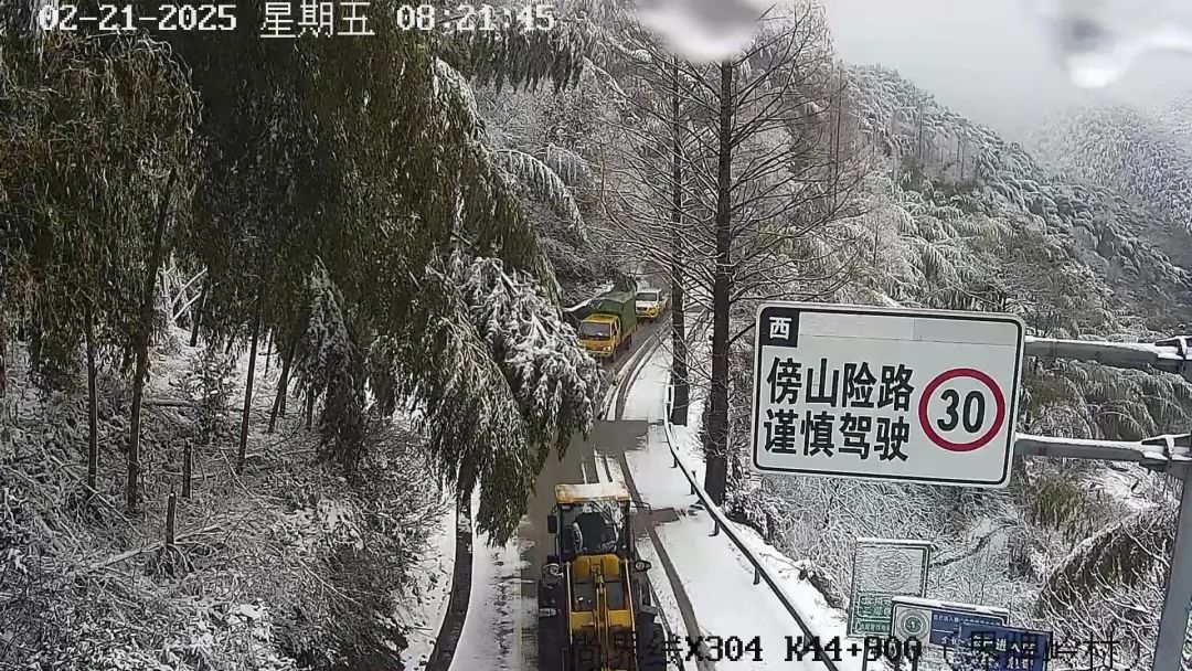 2月20日晚间至21日凌晨,尚界线、董东线、北嵊线部分路段普降小到中雪,董东线K28+570(嵊州交界)路面积雪较厚。